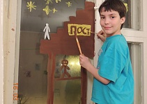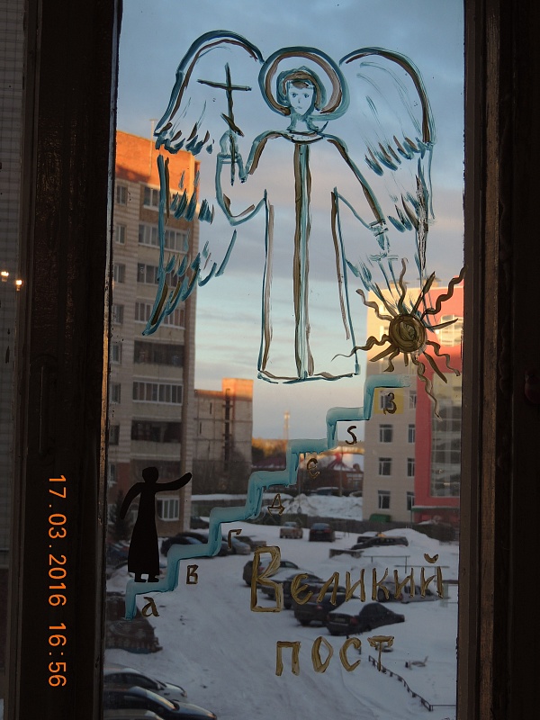 Без штор окно становится немного скучным и каким-то голым. Мы взяли обычную гуашь – эта краска легко смывается – и нарисовали на окне семь ступенек, ведущих вверх. С одной стороны, это память о Лествице, которая, кстати, вспоминается Церковью в Неделю Иоанна Лествичника, с другой ― образ поста как пути к Богу. На каждой ступеньке написали номер. Как дополнительный обучающий элемент можно обозначить ступеньки не арабскими цифрами, а римскими, если дети их не знают, или церковнославянскими ― и незнакомое написание легко запомнится.