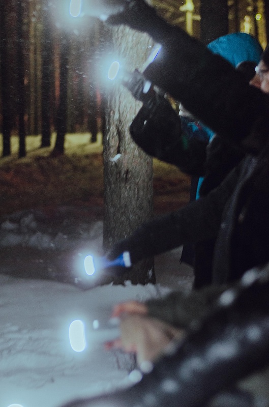 Реализация идеи потребовала решения ряда задач. Помимо того, что определенную сложность создавала зимняя погода, которая в условиях Севера регулярно вносила свои коррективы, пришлось специально приобрести десяток одинаковых фонариков для «рисования» линий определенной толщины, а также устроить кастинг среди участников, чтобы подобрать специалистов одного роста.