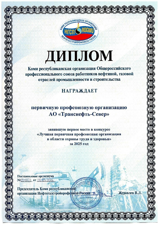 Первичная профсоюзная организация АО «Транснефть – Север» признана лучшей в Республике Коми